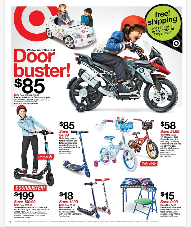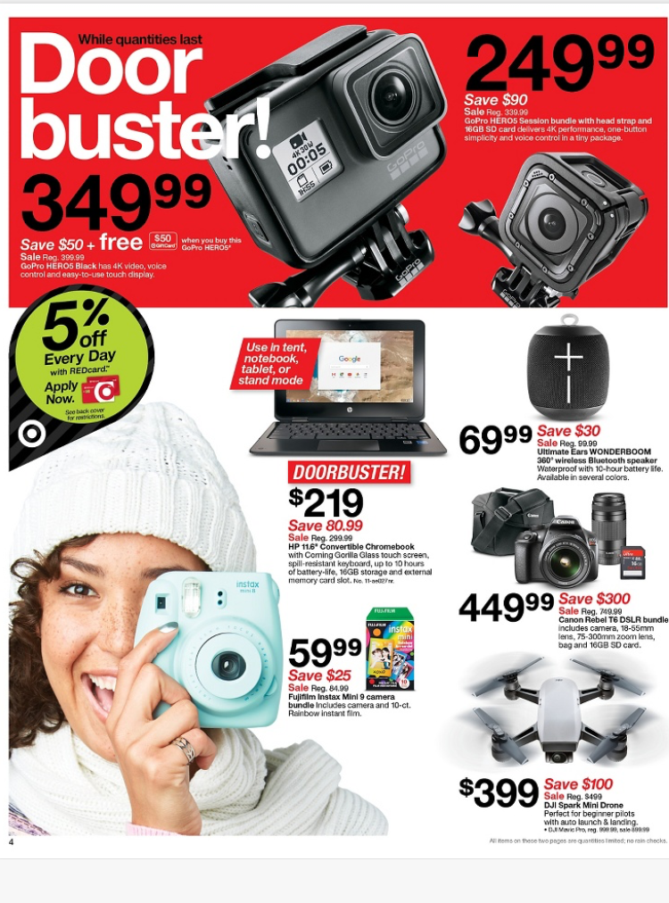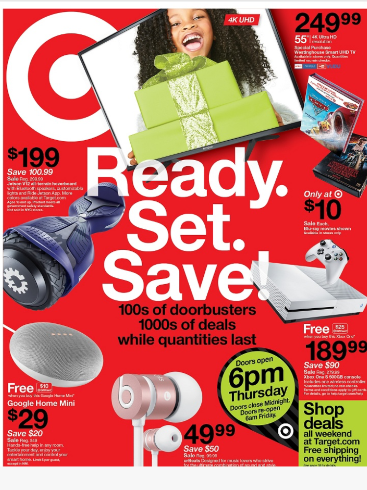 作為全美排名第二最受歡迎的連鎖大賣場,Target的確實至名歸,剛剛發布熱騰騰的2017年黑色星期五Black Friday Sale and Doorbuster衝破門檻翻牆折扣清單超級無敵給力,從最新的iPhone8, Apple watch, Go Pro, FitBit, DJI mini drone遙控可攝影無人機等3C產品,各種令主婦荷包失守的精美廚房用品果汁機咖啡機吸塵器,到最新最夯的兒童玩具和服飾,許多令大家肖想已久遲遲沒有下手的口袋購物清單都榜上有名,折扣範圍大而且力度夠強,可以預想從11/23到11/25每一家Target門店一定是大暴動擠得水洩不通,折扣商品一定也是瞬間秒殺或缺貨缺size。作為最精明的消費者,我們一定要事先做好萬全的準備,將所有想買要買非買不可的東西沙盤演練好,不論你當天是坐在太平洋另一邊家中的沙發拿著手機猛滑,還是帶好毛帽穿好羽絨衣雪靴手套準備冒著零下溫度直接殺入第一線戰場,或是跟我一樣雖然離Target只有10分鐘的車距還是寧可在家裡啃著火雞翹著二郎腿網購,現在就讓我們來做好準備工作,認真研究這些多到令人眼花撩亂心癢癢的剁手清單