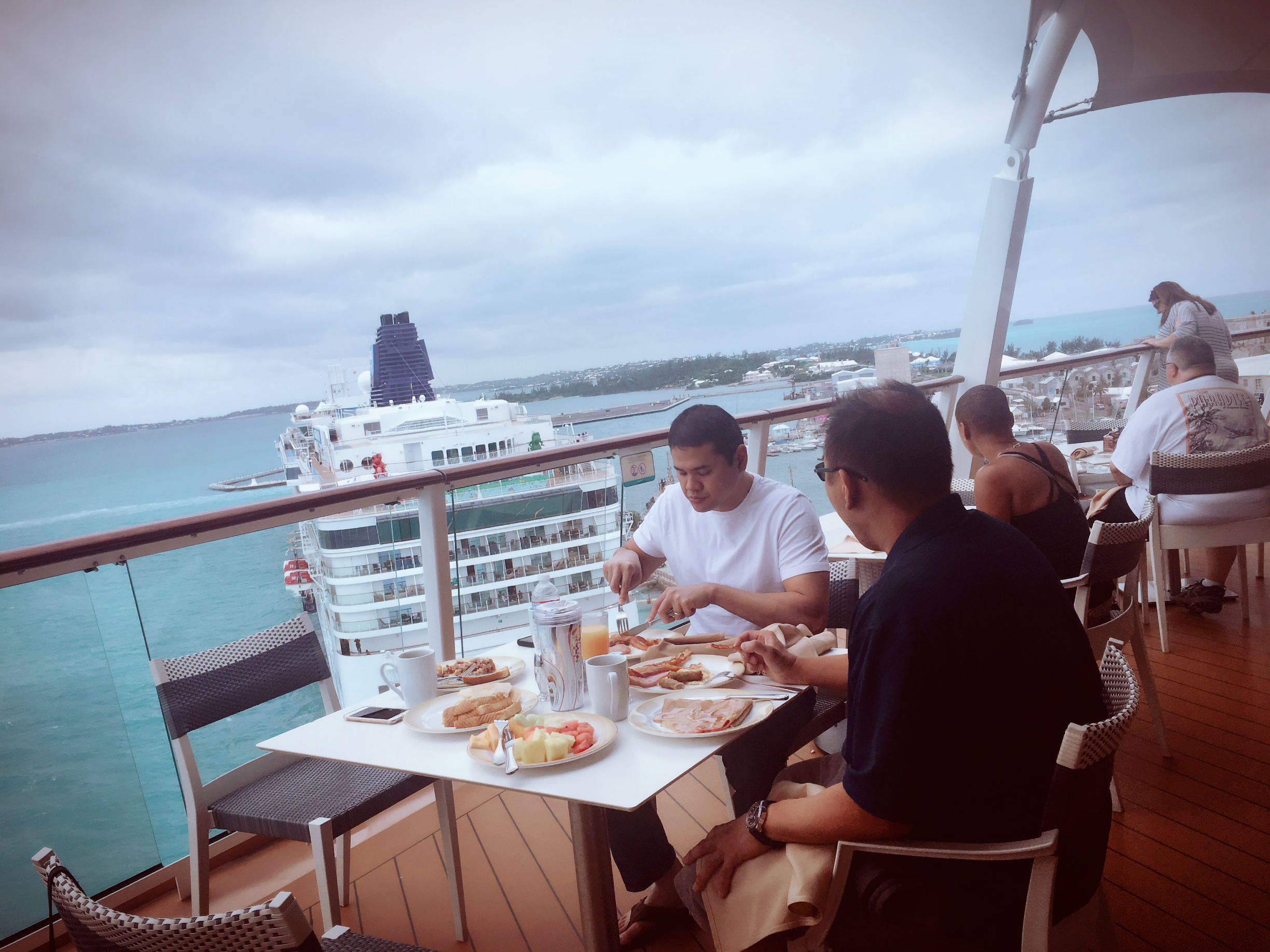說說吃的: 船上的基本都是任吃任喝, 酒水飲料需要額外付, 喝得多的建議買個package, soda要額外付錢, 但是冰水熱水,熱巧克力, 熱茶, ice tea, 檸檬茶那些都是免費的. 早餐和中餐都是去buffet或是其他cafe吃的, 當然晚餐也有buffet, 但是我會建議去main dinning room吃, 服務很好, 而且菜式也相對精緻些 (我覺得跟飛機上商務艙的餐點差不多) 雖然比不上價格比較高的餐廳, 但是在船上那麼多天大廚每天要餵飽幾千人的肚子,能體驗不同的菜式已經挺滿足的了. 而且還有3個course前菜, 主菜,甜點, 有兩天會是formal night需要穿正裝, 有一天是lobster night有龍蝦, 需要特別說明一下, dinning room也是buffet形式的, 所以你可以點好多份前菜和主菜和甜品的, 只要你吃的完. 我們每天都點滿多,主要是因為玩了一天會超餓的. 船上的食物ㄧ定都是冷凍的, 不會很新鮮, 不太吹毛求疵的話, 賣相還是不錯挺精緻的. 牛排啊, 各種魚啊, 蝦啊, 干貝啊, 羊排羊腿, 鴨胸鴨腿, 雞胸, 之類的菜單都會有,而且船上的服務員的服務都超級好, 要是平時去的餐館都有這種服務水準就好了! buffet可以隨便坐, 我喜歡坐靠海的或戶外的位置, 在汪洋大海中閃耀的陽光下吃東西也太浪漫了! 晚餐的話每天的餐桌是固定的, 服務生也是固定的, 我們的服務生好nice, 而且熟絡了他們會推薦什麼好吃, 我們點的菜也給我們加大分量。 想要有不同的選擇船上也有一些付費的餐廳像日本料理,牛排館,Johnny Rocket, Jamie Oliver等等或是免費的cafe, pizza點心店, hotdog stand可以解饞。