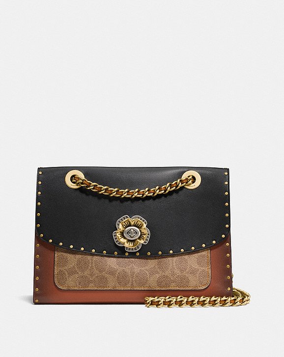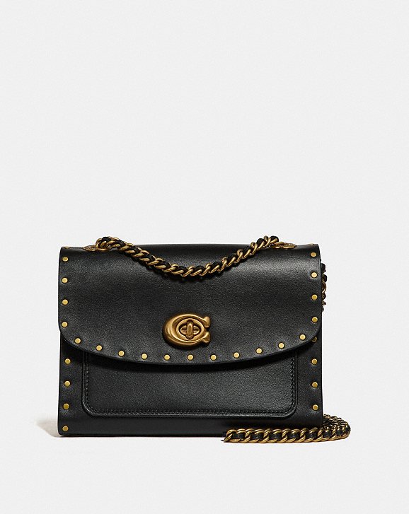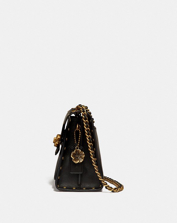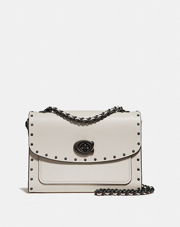 如果喜歡素雅簡單一點的款式,Parker系列也可以滿足你,下面這款 Parker 18 With Border Rivets黑白兩色鉚釘包,全素色皮革沒有logo花紋,以C型暗扣維持簡潔風格,然後把山茶花改為吊飾也是一種巧思,英國售價295磅