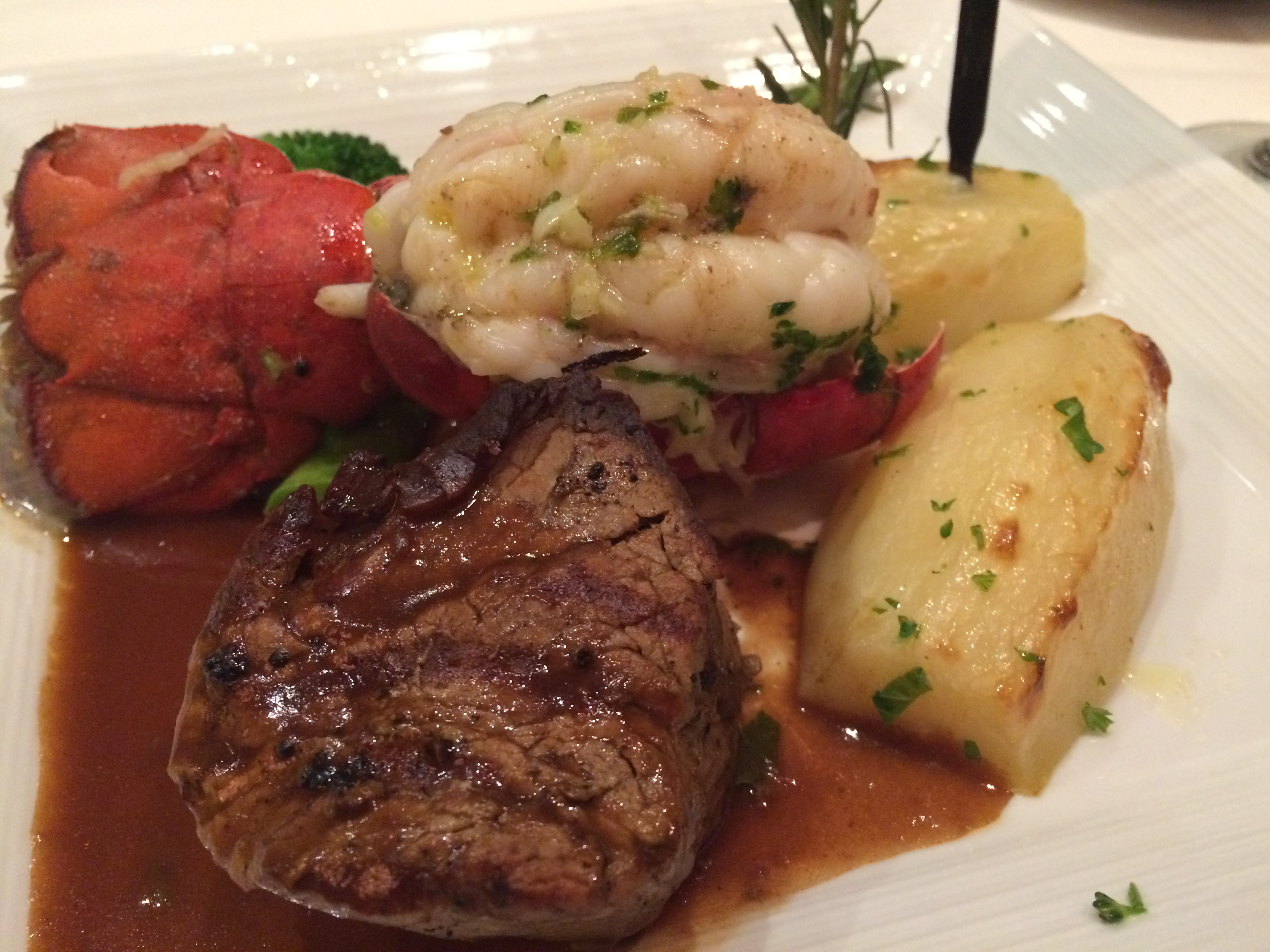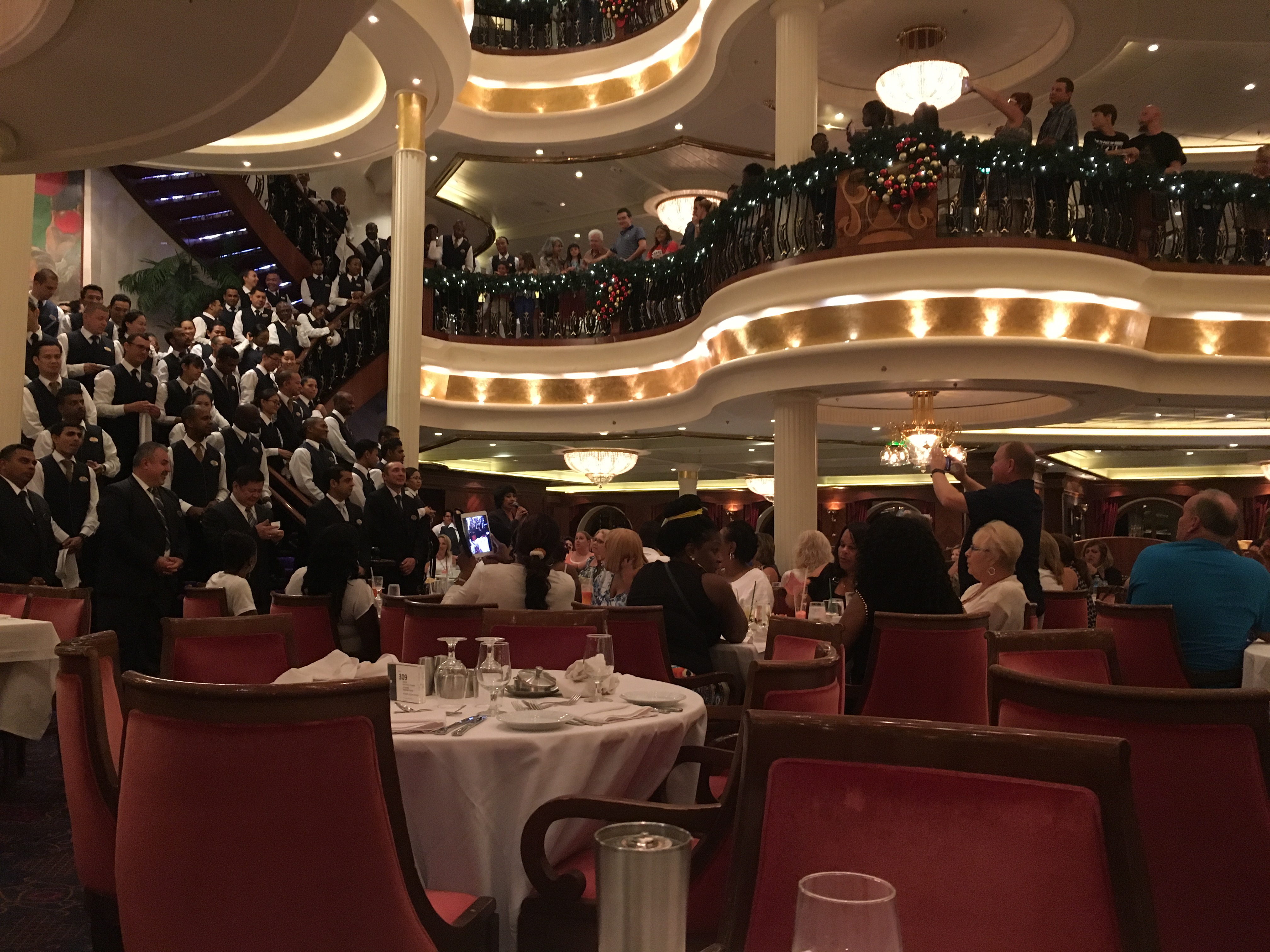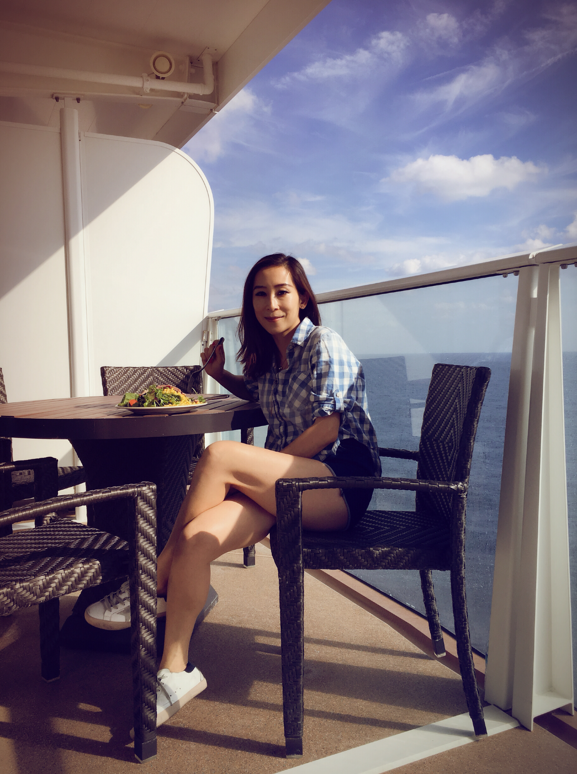 說說吃的: 船上的基本都是任吃任喝, 酒水飲料需要額外付, 喝得多的建議買個package, soda要額外付錢, 但是冰水熱水,熱巧克力, 熱茶, ice tea, 檸檬茶那些都是免費的. 早餐和中餐都是去buffet或是其他cafe吃的, 當然晚餐也有buffet, 但是我會建議去main dinning room吃, 服務很好, 而且菜式也相對精緻些 (我覺得跟飛機上商務艙的餐點差不多) 雖然比不上價格比較高的餐廳, 但是在船上那麼多天大廚每天要餵飽幾千人的肚子,能體驗不同的菜式已經挺滿足的了. 而且還有3個course前菜, 主菜,甜點, 有兩天會是formal night需要穿正裝, 有一天是lobster night有龍蝦, 需要特別說明一下, dinning room也是buffet形式的, 所以你可以點好多份前菜和主菜和甜品的, 只要你吃的完. 我們每天都點滿多,主要是因為玩了一天會超餓的. 船上的食物ㄧ定都是冷凍的, 不會很新鮮, 不太吹毛求疵的話, 賣相還是不錯挺精緻的. 牛排啊, 各種魚啊, 蝦啊, 干貝啊, 羊排羊腿, 鴨胸鴨腿, 雞胸, 之類的菜單都會有,而且船上的服務員的服務都超級好, 要是平時去的餐館都有這種服務水準就好了! buffet可以隨便坐, 我喜歡坐靠海的或戶外的位置, 在汪洋大海中閃耀的陽光下吃東西也太浪漫了! 晚餐的話每天的餐桌是固定的, 服務生也是固定的, 我們的服務生好nice, 而且熟絡了他們會推薦什麼好吃, 我們點的菜也給我們加大分量。 想要有不同的選擇船上也有一些付費的餐廳像日本料理,牛排館,Johnny Rocket, Jamie Oliver等等或是免費的cafe, pizza點心店, hotdog stand可以解饞。