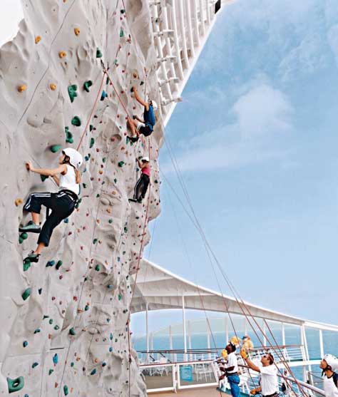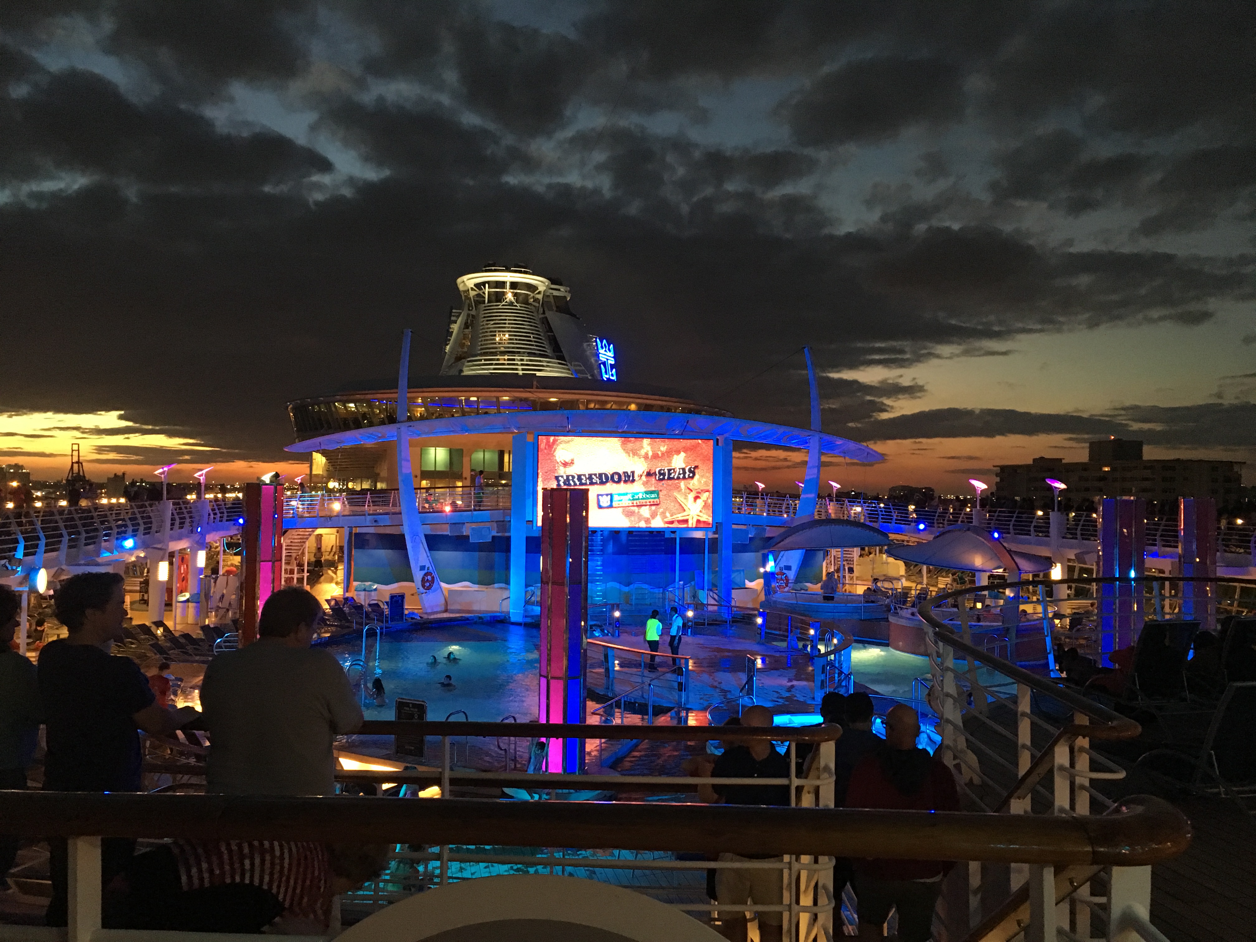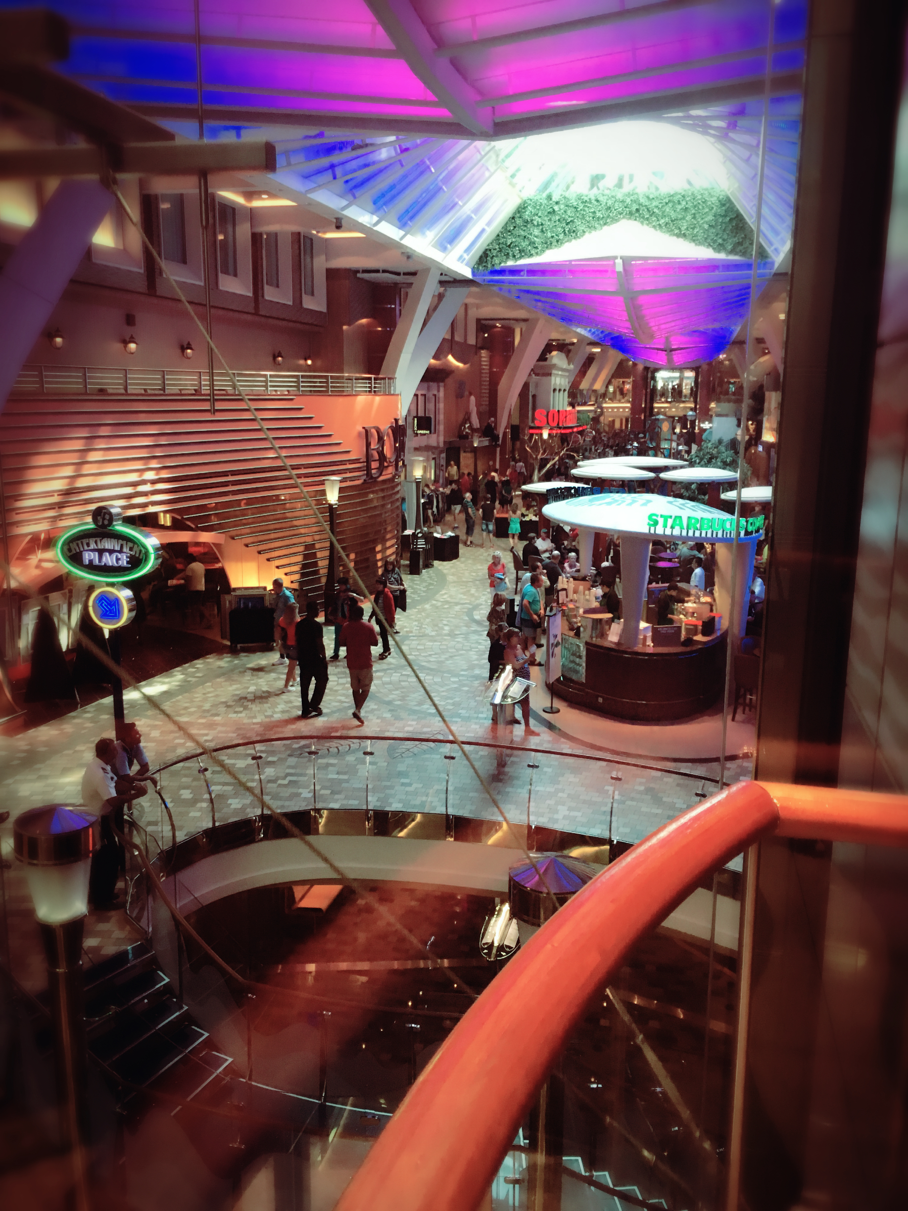 船上的概況: 船上的室外那幾層都有好多遊樂設施包括大型滑水道,攀岩,模擬skydiving 模擬衝浪,zip line 繩索,依各艘船的配備而定,視天氣狀況開放,室內有籃球,排球,乒乓球, airhocky ,密室逃脫遊戲間,電玩室和溜冰場(記得帶長褲襪子)還有碰碰車,各種游泳池, 熱水池, 小朋友的戲水池, 大人可以帶飲料relax的池, jacuzzi ,mini高爾夫場, 滑梯, 練習衝浪(有教練免費教你的), 酒吧, 露天曬太陽的地方, 跑道, 還有免費冰淇淋機任你吃小朋友超愛的,還有好多東西讓大家去explore. 免稅店賣酒和化妝品護膚品鑽石之類, 看表演的歌劇場,賭場, 健身房(看著大海健身超級有動力), 做spa的店, 各色餐館,酒吧,聽音樂的地方, 反正就是閒著就可以去瞎逛, 看看每天的項目有什麼感興趣的就去參加. 如果有宗教信仰需要祈禱朝拜, 想在船上結婚蜜月的也可以, 最頂層就有一個小小的chapel教堂.