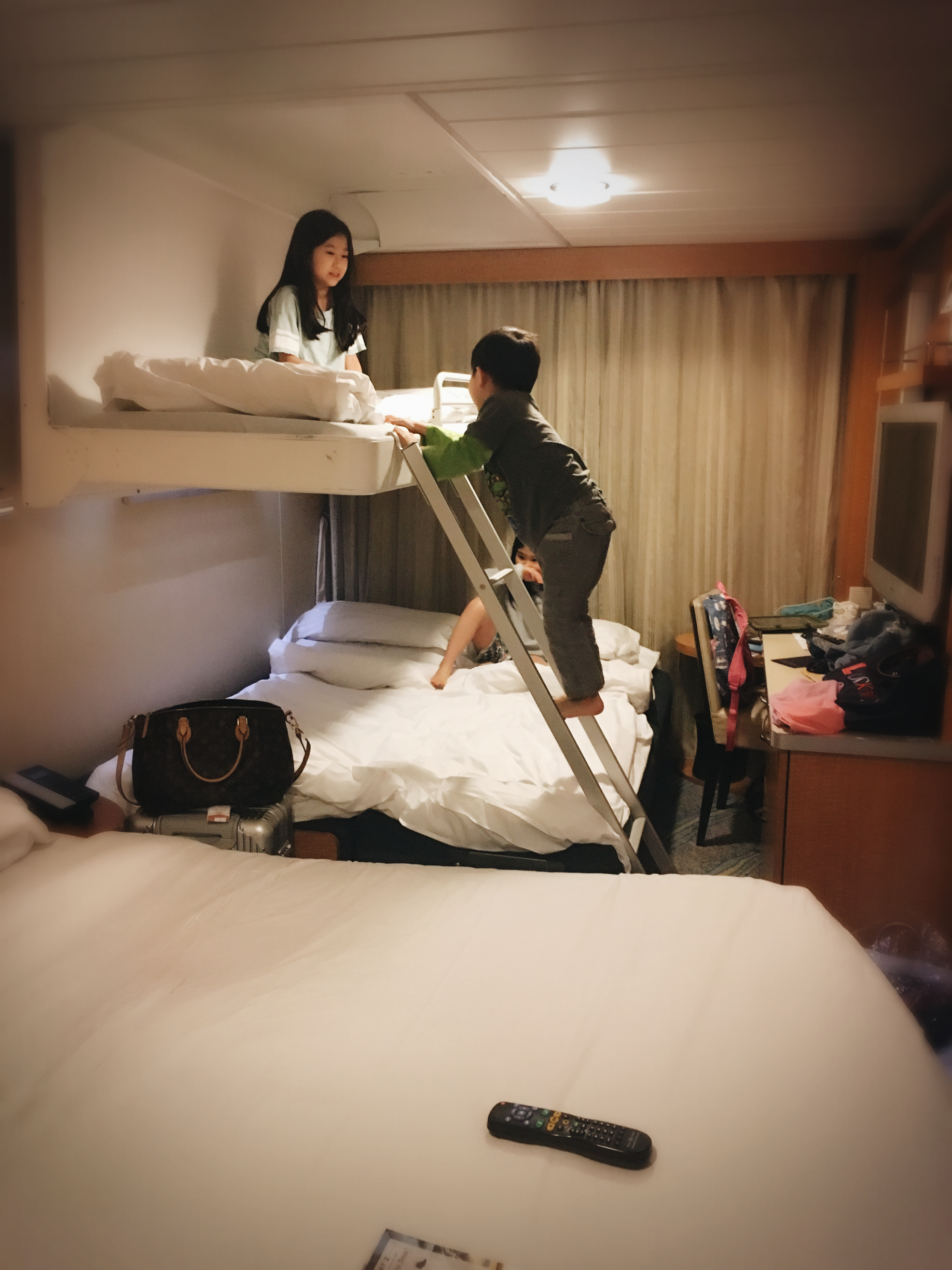 3. 游輪選房上面, 一般都有幾個級別, 就是有窗的, 沒窗的, 外加個陽台的, 或者是豪華套房的, 大家根據需要定就好了, 至於我是完全不會呆在房間里的, 一天到晚到處竄,游泳看表演參加船上的節目到處吃瞎逛的, 房間只是用來睡覺, 第一次坐遊輪的時候就定了個便宜的有窗房,但後來因爲帶小毛頭及家人,才升級到陽台房,家庭房,最後還撒大錢過了過土豪癮嘗試了兩房的suite🤑🤑🤑但是這裡提醒大家一下,怕吵的不要選底層的因為發動機什麼的聲音還是有點的, 怕暈船搖晃的不要選高的, 建議選在中間的層數比較保險,怕回房要走好遠的建議訂在靠船頭和船尾有電梯的附近, 一出電梯就可以到房不用到處跑.