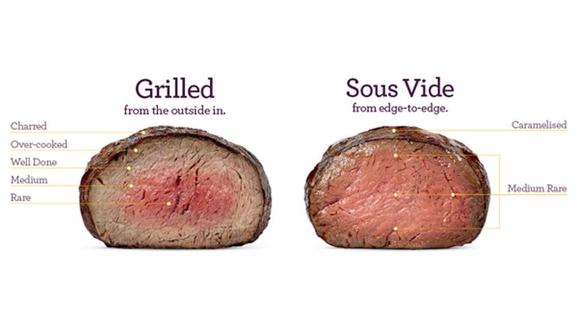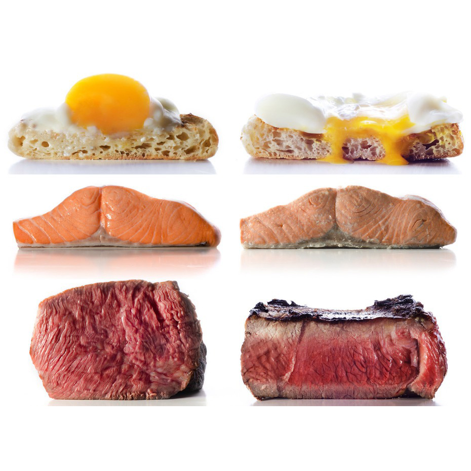 用牛排來舉例,一般傳統的大火煎烤會讓表層焦化,但內層因加熱不均勻導致部分過熟,中心過生,sous vide烹調法做出來的牛排則是整塊肉均勻鮮嫩,唯有最外層金黃焦脆,下面圖示可以明顯看出不同,另一張圖左側是sous vide烹調法做出的料理,明顯比右側傳統作法更完美。這種高端的烹調法其實已經在許多高級餐廳行之有年,只是以往要這樣烹煮食物需要長時間人力物力,器具昂貴又重又龐大,所以要吃到鮮嫩多汁的小春雞,油封鴨胸或煎到剛剛好外脆內滑嫩的牛排魚排,大家只能捧著錢追隨三星大廚的腳步,一般家庭料理是不可能這樣處理的。但舒肥機的出現改變了這個規則,輕巧的儀器簡單的操作,加上非常親民的誘人價位,現在人人都可以變成居家神廚,做出媲美餐廳零失敗的完美料理。